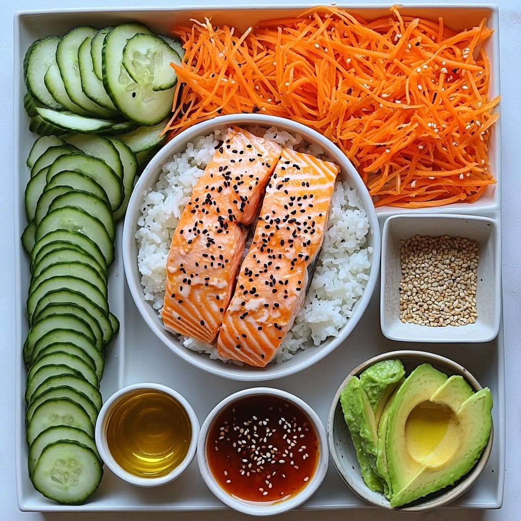 Start by dividing the warm, fluffy cooked rice evenly between your bowls. Then, top each portion with the golden baked salmon pieces, followed by fresh sliced cucumber, shredded carrots, and creamy sliced avocado. Each component adds its signature flavor and texture, creating a bowl that’s as beautiful as it is delicious.