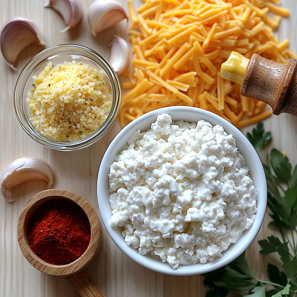 - Prepare the mixture: In a mixing bowl, combine the cottage cheese, grated Parmesan or cheddar cheese, garlic powder, smoked paprika (if using), salt, and freshly ground black pepper. Stir well until all ingredients are thoroughly blended. Allow the mixture to sit for 5 minutes to help it absorb the flavors and firm up slightly for easy shaping.