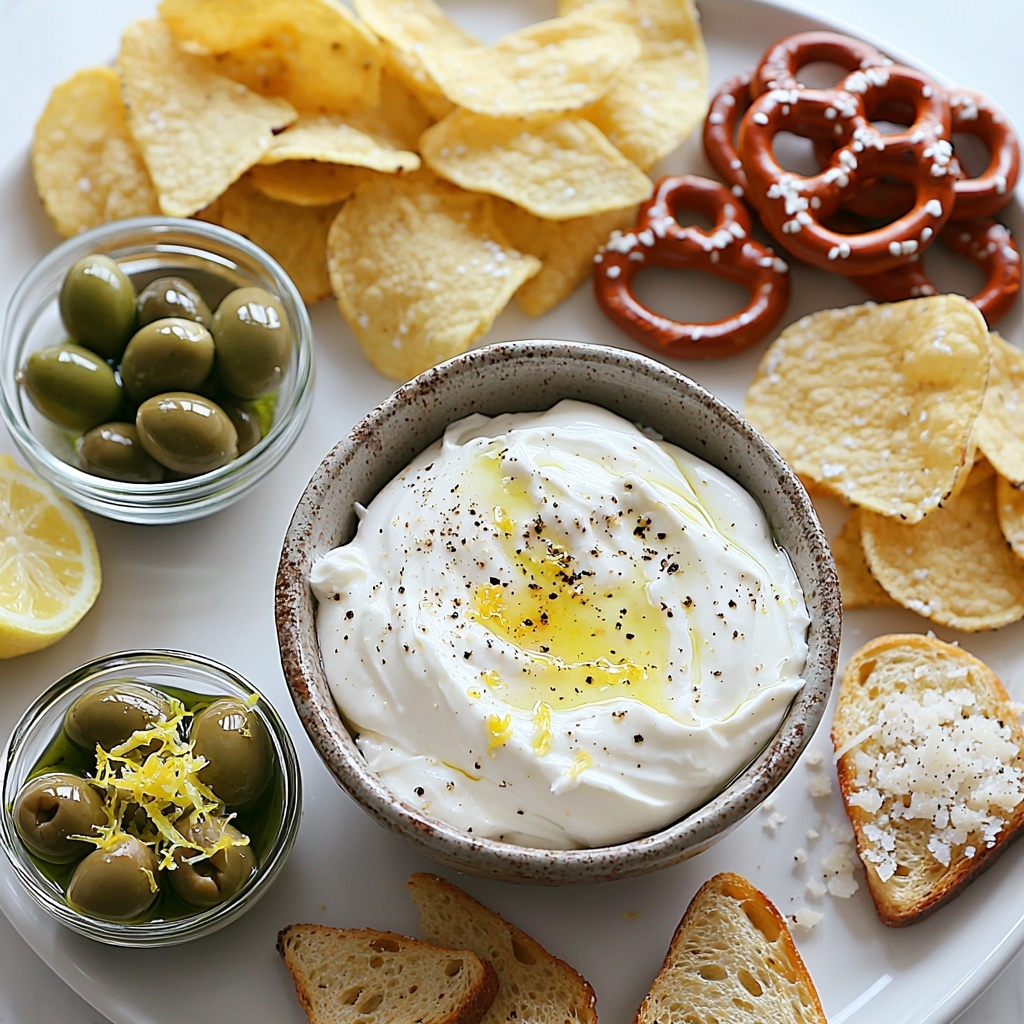 - Garnish and serve: Just before serving, top the dip with sliced green olives, a sprinkle of extra lemon zest, and some additional cracked black pepper for visual appeal and added flavor.