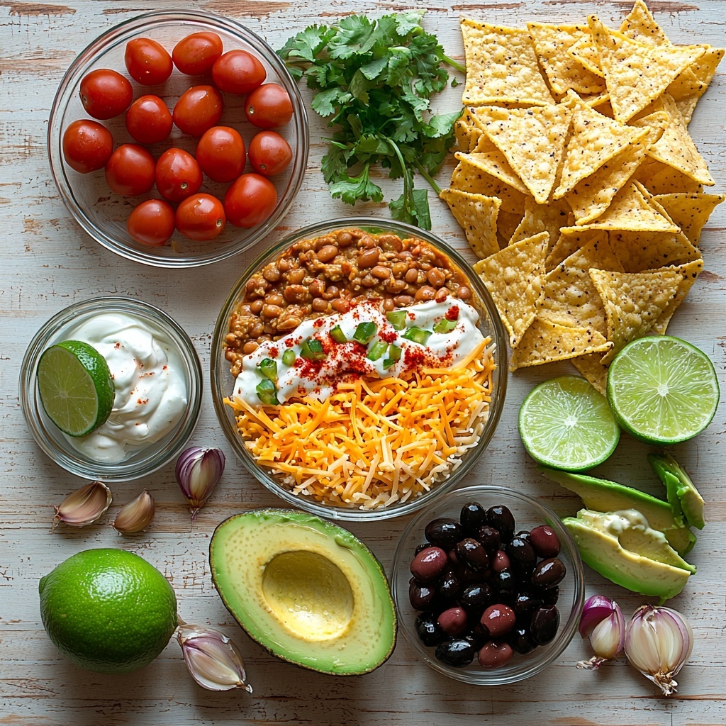 Chop your cherry or grape tomatoes into small pieces, shred the Mexican cheese blend finely, chop the black olives, and thinly slice the green onion greens. Having these fresh, finely chopped ingredients ready makes assembly quick and ensures every bite has a balanced texture and color.