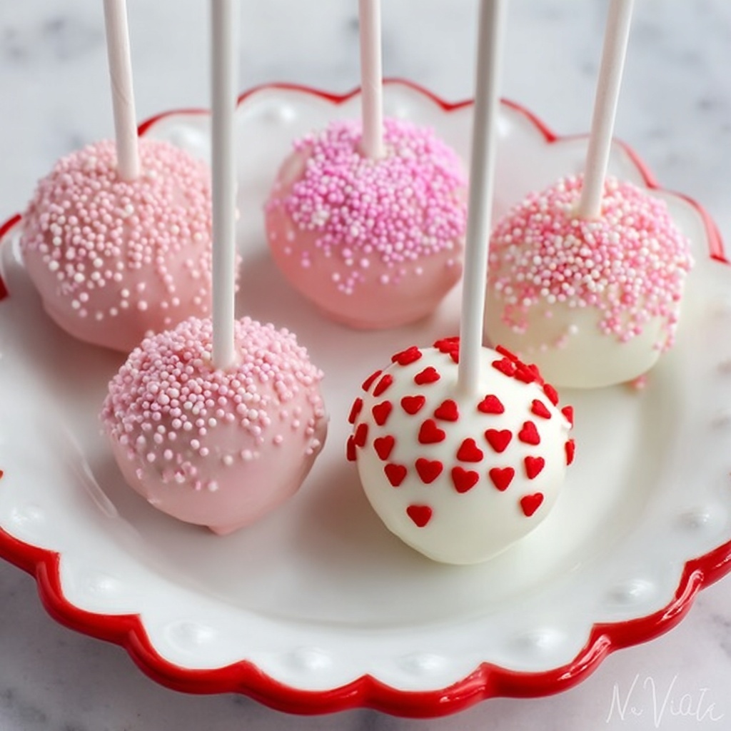 Delightfully sweet strawberry cake pops made from moist strawberry cake mix, coated in creamy vanilla melting chocolate tinted with pink or red food coloring, and adorned with festive Valentine’s Day sprinkles. Perfect bite-sized treats for parties or celebrations.